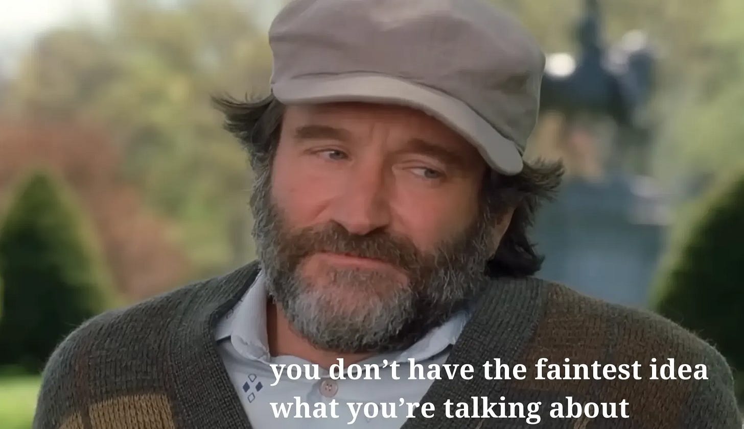 God, thanks for reminding me about that scene in Good Will Hunting (miss Robin Williams) - really encapsulates the lack of perspective that Claude/other LLMs really have. Can't replace actual lived experience.