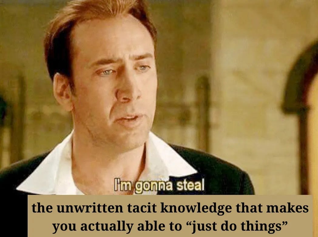 But a great deal of valuable information and knowledge is tacit. Secret. Occluded. Not legible. Unwritten. Bound up in NDAs and in the experience of people who have already tried to solve these problems and the lessons they learned that have never been committed to publicly-available text -- or even the private repositories of text drawn from the entire Internet, video transcripts, books, historical artifacts, public datasets, even synthetic text outputs from higher level LLMs or whatever other massive sources of tokens Google/OpenAI/Anthropic can delve into with their very deep pockets.